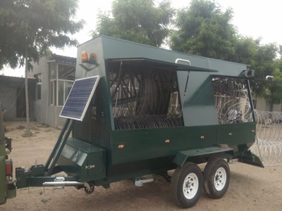 No Police or Military Organisation can afford to be without this valuable tool.Barriers are constructed of Barbed Tape Concertina (Razor Wire Coils) separated with high tensile anti-tangle strut wiresBarriers are supplied in 75 meter lengths which are compressed into compact modules which are simple to handle and can be stored effectively.Winches are supplied with the carrier units to re-compress the barrier into compact modules after deployment - Strapping equipment is supplied to bind the modulesEach module is supplied with 2 handling frames and connection fixtures
